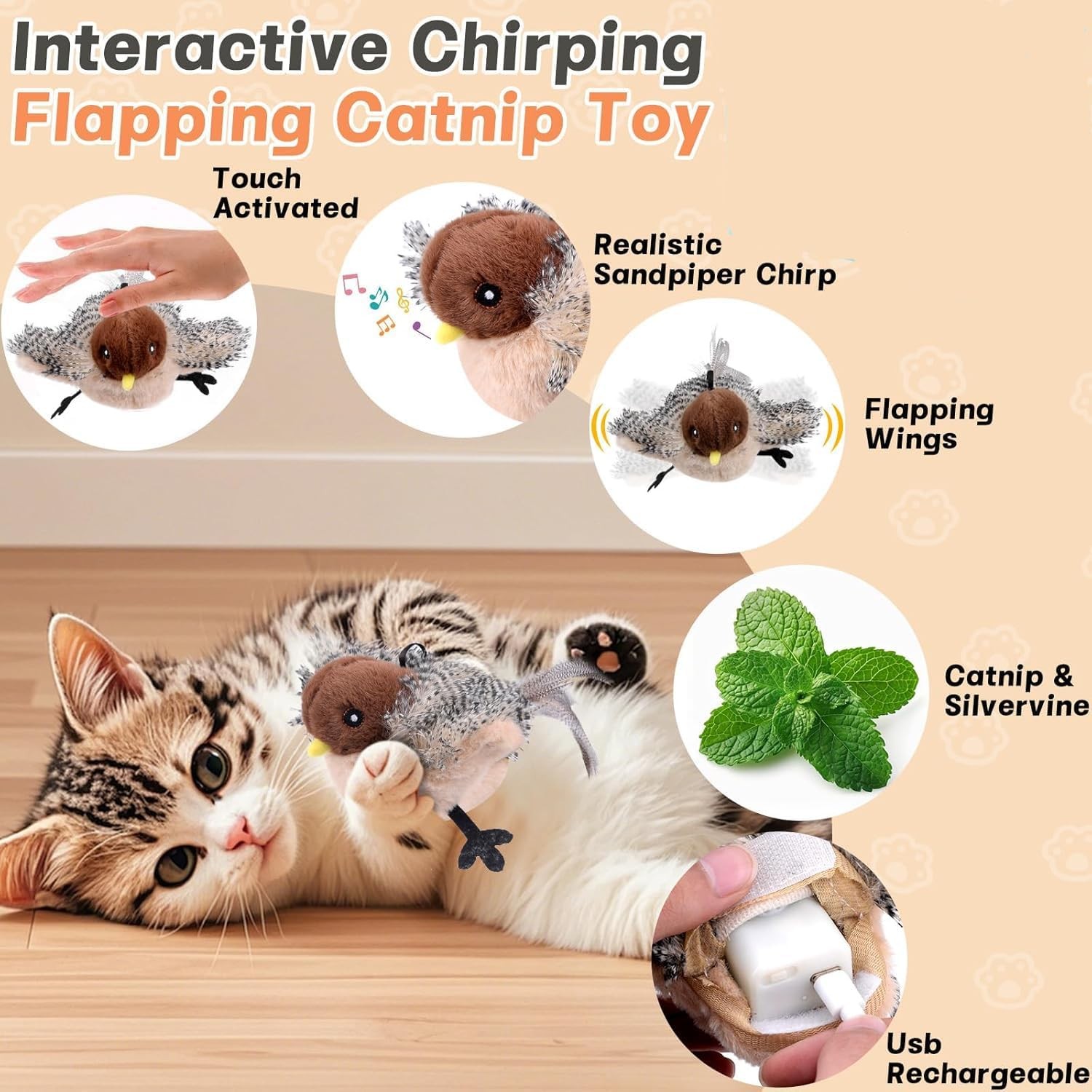 Elevate your cat’s playtime with this ultra-realistic interactive bird toy that mimics real sparrow sounds and flapping wings when touched, featuring a feathered tail, soft plush body, USB rechargeable functionality, and a built-in mix of catnip and silvervine to stimulate natural hunting instincts, relieve boredom, reduce anxiety, and keep indoor cats mentally and physically active, while the durable and washable design ensures safe, long-lasting fun, making it a perfect gift for curious felines and loving pet owners alike.