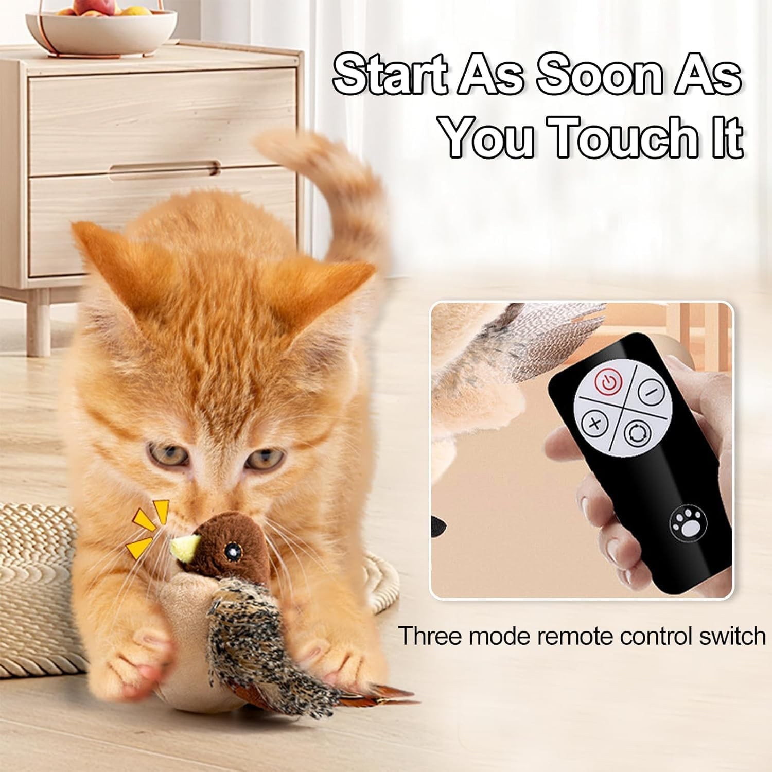 • Realistic bird sounds and flapping wings instantly grab your cat’s attention and awaken their natural hunting instincts.