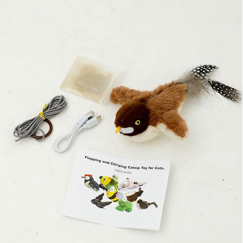 interactive electric sparrow designed to mimic the look and movement of a real bird. This high-quality toy features soft, durable materials that are safe for cats to bite, claw, and chase, making it the perfect choice for indoor play. The touch-activated flapping wings stimulate your cat’s natural hunting instincts, keeping them engaged for hours while promoting healthy exercise and reducing boredom or destructive behavior. With a built-in rechargeable battery and USB charging cable, you’ll never have to worry about replacing batteries, making it an eco-friendly and cost-effective solution for pet owners. Give your feline friend a premium playtime experience with this interactive cat toy that combines fun, safety, and convenience in one innovative design. Perfect for all cat breeds and ages, it’s the ultimate gift for your furry companion.